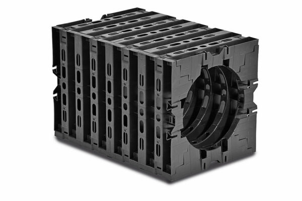 The VARIO-Box system allows the height to be adjusted and offers various tunnel openings from 170 to 500 mm in diameter which enables easy installation in the excavated drainage trench.
