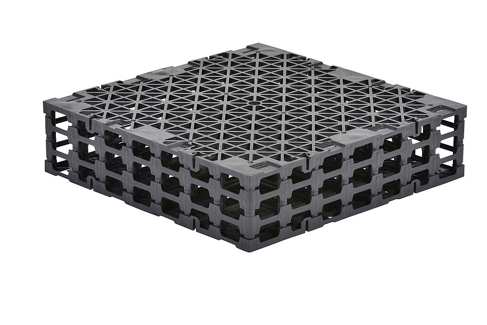 Drainage elements are well suited for installation below the surface owing to their very high mechanical strength. Due to the large free volume offered by the modular system, it is easily installed on the construction site. The modular system allows for adjustable height enabling it to adapt to the respective installation requirements.